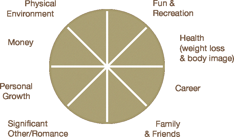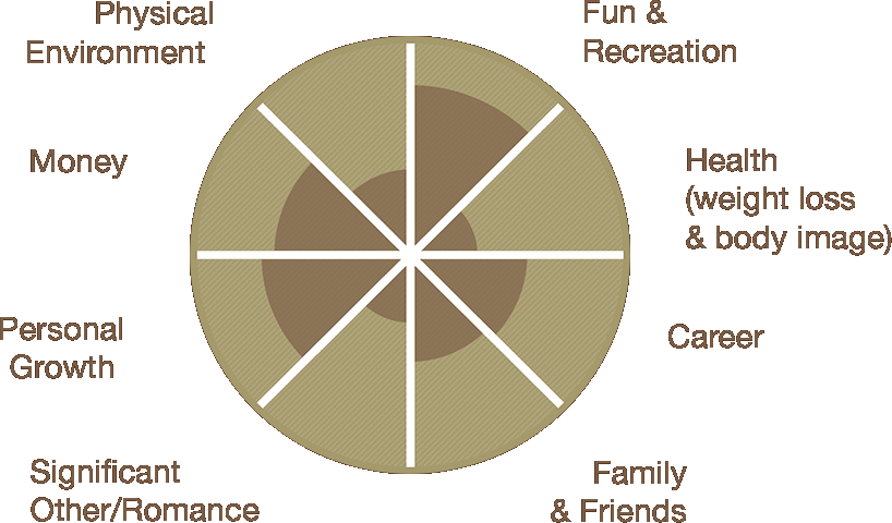 The eight sections in the Wheel of Life represent balance. Consider the centre of the wheel as 0 and the outer edge as 10, rank your level of satisfaction with each area by drawing a line in each section to create a new outer edge (see example below)